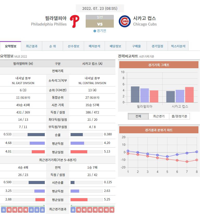 열람중 [스포츠분석][MLB분석] 7월 23일 MLB 분석 필라델피아 VS 시카고컵스 2022.07.22 224