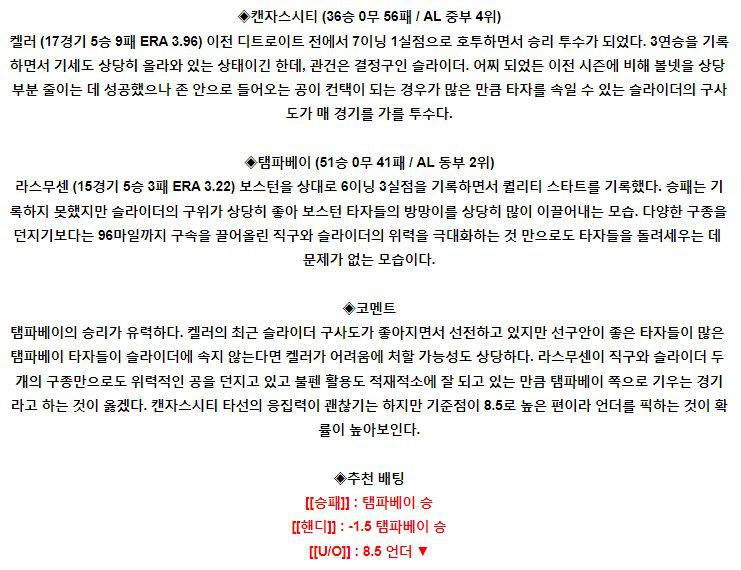 두산 베어스 (이영하 6승5패 4.26) 이영하 투수는 직전경기(7/10) 홈에서 LG 상대로 3이닝 4실점 패배를 기록했으며 이전경기(7/5) 홈에서 키움 상대로 5.1이닝 1실점 노디시전을 기록했다. 3연승이 중단되는 패배가 나왔으며 올시즌 17경기 6승5패, 7경기 QS 성적이며 5월 5경기 2승1패, 2.52, 6월 5경기 3승1패, 3.64…