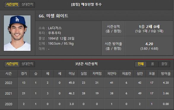 그에 비해 다저스의 선발 화이트는 최근 부상자들이 많이 나오며 선발 로테이션에 합류하긴 했지만