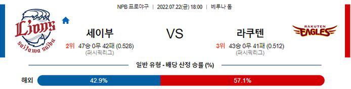 2점차 리드를 지키지 못하고 9회 역전패를 당하며 지바롯데 원정에서 3연패를 당한 세이부와 소프트뱅크와 시리즈를 2승1패로 마무리한 라쿠텐의 만남 이다. 7월 2군에서 보여준 와타나베 유타로 투수의 투구내용은 지난시즌 중반에 좋았을 당시를 연상케 하는 모습 이였다고 생각 된다. 와타나베 유타로 투수가 사고(?)를 칠수 있는 요주의 경기다. 세이부 승리 가능성을 추천 한다.
