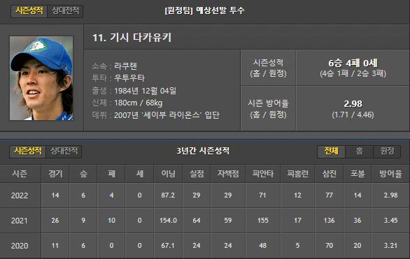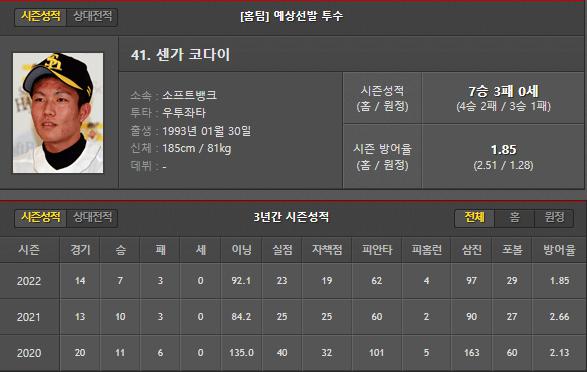 최근 소프트뱅크전 7이닝 무실점을 기록하며 소프트뱅크 상대로 좋은 피칭을 보인 적이 있습니다.