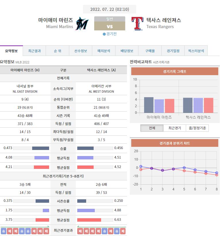 [스포츠분석][MLB분석] 7월 22일 MLB 분석 마이애미 VS 텍사스