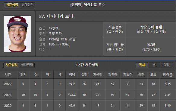 타키나카 선수는 이번 시즌 9경기 1승 5패 55.2이닝 62피안타 27실점으로