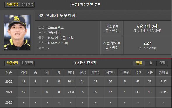 오제키 선수는 이번 시즌 16경기 6승 4패 91.1이닝 70피안타 24실점으로