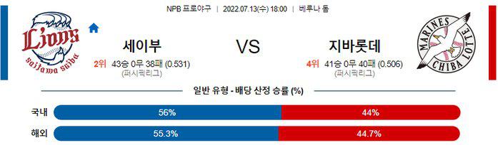전일 경기 2-4, 패배로 3연승이 중단 되었지만 9회 추격의 득점을 뽑아냈다는 것이 수요일 세이부 타선에게 긍정적인 요소로 작용할 것이다. 또한, 점검의 시간을 보내고 복귀하는 이시카와 아유무 투수는 최근 2경기에서 탈삼진을 기록하지 못하고 있고 싱커의 제구가 흔들리고 있었다. 세이부 승리 가능성을 추천 한다.