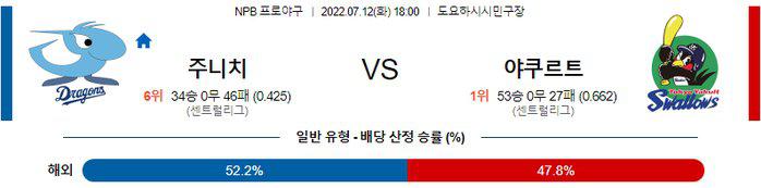 지난주 2승1무2패를 기록한 주니치와 1승3패 성적을 기록한 야쿠르트의 만남 이다. 두 팀의 이번 경기는 타자들에게 유리한 도요하시시민구장 중립경기로 펼쳐지게 된다. 오버 가능성을 1순위 픽으로 추천하며 좋은날과 좋지 않은 날의 투구내용에 차이가 컸고 볼넷 허용이 많다는 고질병이 있었던 카사하라 쇼타로 투수 보다는 사이 스니드 투수가 선발 싸움에서 우위에 있다. 야쿠르트 승리 가능성을 추천 한다.