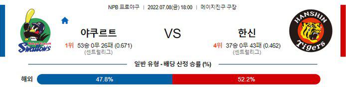 전일 경기에서 타선이 폭발한 야쿠르트라는 것이 주력 승부에서 제외하게 만들지만 센트럴리그 다승과 평균자책점 1위를 달리고 있는 아오야기 코요우 투수를 믿어야 히는 경기다. 한신 승리 가능성을 추천 한다.
