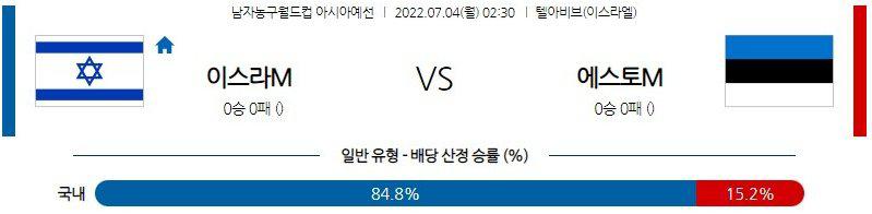 이스라엘의 승리를 본다. 블랫과 소르킨 등 내,외곽을 오가며 득점을 올려줄 선수가 있고 토머 지나트가 탄탄한 피지컬을 앞세워 골 밑에서 리바운드 경합을 할 수 있다. 또, 원정에서도 이미 10점차 승리를 거두며 에스토니아 상대로 강점을 보였기에 홈에서 더 강점을 보일 것이다. 이스라엘이 빠른 템포로 경기에 나설 것이기에 오버 경기다.