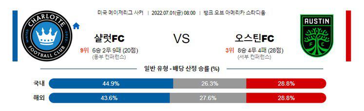샬럿의 최근 6경기 중 4경기에서 오버(2.5 기준)가 나온 점, 오스틴도 최근 6경기 중 5경기에서 오버(2.5 기준)가 나온 점을 고려하면 오버(2.5 기준)의 가능성이 높겠다. 또한 샬럿은 이번 시즌 홈과 원정에서의 성적이 극명하게 갈리는 팀 중 하나. 홈에서는 매우 좋은 모습이지만, 원정에서는 단 1승도 거두지 못하고 있다. 오스틴도 원정에서의 성적이 썩 좋지 않기 때문에 이번 일정은 홈 팀 샬럿의 승리가 예상된다.