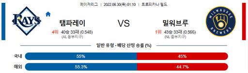 6월 30일 01:10 MLB 탬파베이 : 밀워키