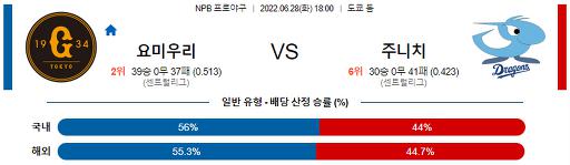 요미우리 다카하시는 이전 경기 5월 22일, 한신 타선을 상대로 1.2이닝, 3개의 피안타, 4실점으로 패전투수가 됐다. 이후 2군으로 내려갔고, 이전 시즌 활약상을 볼 수 없는 다카하시는 올 시즌 초반에 무너지는 경우가 눈에 띈다. 금년 주니치와 3경기, 5이닝, ERA 7.20, 오늘 맹물 주니치 타선을 상대로 어려운 피칭이 예상된다.주니치 오가사와라는 이전 경기 6월 21일, 불방망이 야쿠르트 타선을 상대로 8이닝, 3개의 피안타, 피홈런 1개, 1실점으로 호투하며 마운드를 내려왔다. 오늘 익숙치 않은 야마가타 구장 마운드이지만, 흔들리고 있는 요미우리 투수진을 상대로 맹물 타선의 도움을 받으며, 이전 경기 호투를 여세로 오카모토, 마루 등 요미우리 장거리포에게 경계 투구하며 승운을 잡을 것으로 기대한다원정팀 주니치의 승리를 예측한다.