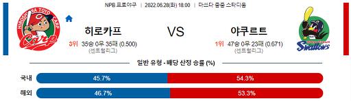 히로시마 도코다는 이전 경기 6월 21일, 한신 타선을 상대로 7이닝, 4개의 피안타, 피홈런 1개, 2실점으로 승리투수가 됐다. 금년 야쿠르트와 2경기, ERA 5.00으로 애매한 성적을 보이고 있는 도코다, 그렇지만 최근 긴 이닝을 소화하며 3연승을 달리고 있다. 오늘 이 여세를 몰아 주포 무라카미 등 불방망이 타쿠르트 타선을 봉쇄하며 차분한 피칭으로 승운을 잡을 것으로 기대한다.야쿠르트 오가와는 이전 경기 6월 21일, 주니치 타선을 상대로 9이닝, 2개의 피안타, 1실점으로 마운드를 내려왔다. 타선의 폭발력으로 평균 7득점하며 리그 1위를 달리고 있는 야쿠르트, 오가와도 여기에 편승하여 교류전 무패 등 긴 이닝을 소화하며 호투하고 있다. 투수전으로 예상되며, 기쿠치, 사카쿠라 등 히로시마 타선이 다시 살아나고 있어 오늘 고전의 피칭이 예상된다.홈팀 히로시마의 승리를 예측한다.