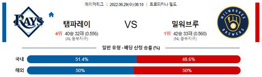 6월 29일 08:10 MLB 탬파베이 : 밀워키