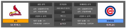 [세인트루이스]세인트루이스의 선발투수는 우완 잭 플래허티다.플래허티는 지난 16일 길었던 부상에서 복귀했다.그러나 2경기 연속 3이닝만 소화하면서 승패 없이 7.50 era를 기록하고 있다.잭 플래허티는 이번 경기에서도 긴 이닝 소화는 불가능할 것으로 보인다.플래허티는 컵스 타선을 상대로 61타수에서 11피안타를 허용한 경험이 있다.윌슨 콘트레라스 상대로 21타수에서 6피안타 얀 곰즈 상대로 3타수에서 1피안타 제이슨 헤이워드 상대로 18타수에서 2피안타를 허용한 경험이 있다.세인트루이스는 최근 2연패뒤 컵스 상대로 승리를 거두면서 준수한 모습을 보여주었다.세인트루이스는 타선에서도 아쉬운 모습을 보여주고 있다.타선에서 토미 에드먼 놀란 아레나도 폴 골드슈미트등 해줘야하는 선수들이 준수한 모습을 보여주면서 팀을 이끌어주고 있는 상황이다.세인트루이스 불펜의 필승조는 전반적으로 불안한 모습을 보여주었지만 최근 경기에서는 나름대로 준수한 모습을 보여주었다.마무리 라이언 헤슬리 지오바니 가예오스 셋업 잭 톰슨 닉 위트그린이 준수한 모습을 보여주었다.이들 필승조는 투구수 부담이 없기 때문에 이번 경기에 문제 없이 등판이 가능할 것으로 보인다. [컵스]컵스의 선발투수는 우완 알렉 밀스다.밀스는 이번 시즌 5경기에 불펜으로만 등판해 0승 1패 8.59 era를 기록하고 있다.밀스는 최근 아쉬운 모습을 보여주며 어려운 경기를 펼쳤ekl 밀스는 세인트루이스 타선을 상대로 39타수에서 11피안타를 허용한 경험이 있다.토미 에드먼 상대로 9타수에서 7피안타 딜런 카슨 상대로 5타수에서 2피안타 폴 골드슈미트 상대로 10타수에서 1피안타를 허용한 경험이 있다.컵스는 최근 7경기에서 2승 5패를 기록하며 아쉬운 모습을 보여주고 있다.컵스는 타선에서 매우 아쉬운 모습을 보여주고 있다.컵스는 타선에서 윌슨 콘트레라스가 매우 좋지 않은 모습을 보여주고 있다.이안 햅이 준수한 타격감을 보여주고 있지만 아직까지는 어려운 경기를 펼치고 있는 것이 아쉬운 상황이다.컵스 불펜의 필승조 마무리 데이비드 로버트슨 셋업 마이클 기븐스 크리스 마틴으로 이루어져있다.이들 필승조는 24일 경기에는 블론세이브를 기록했고 25일 경기에는 홀드와 세이브를 기록하며 흔들리는 모습을 보여주었다.이들 필승조는 기복이 심한 모습을 보여주고 있다.이들 필승조는 투구수 부담이 없기 때문에 이번 경기에 문제 없이 등판이 가능할 것으로 보인다.[결론]플레허티가 컵스를 상대로는 좋은 모습을 보여주었다.콘트레라스에게 고전하기는 하였지만 이외의 타선들에게는 강하였고 오히려 상대 전적이 없는 타선들도 존재한다.홈 경기 이점을 충분히 살려 낼 것으로 보인다.밀스는 골드슈미트에게 상당히 강한 모습을 보여주었다.세인트루이스의 칼슨과 에드먼에게 고전하였지만 다른 핵심 타선들에게 좋은 모습을 보였다.두팀 선발이 비슷한 흐름을 보여줄 가능성이 높은데 타선에서 세인트루이스가 좋은 모습을 보일 가능성이 높다.이 경기는 세인트루이스의 승리를 추천한다.언오버 8.5오버