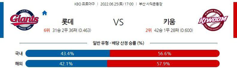 선발 로테이션을 한차례 건너뛰고 재충전의 시간을 보낸 정찬헌 투수는 지난시즌 롯데를 상대로 강점을 보였던 투수다. 또한, 복귀전에서 5이닝 무실점 투구를 기록했지만 퓨처스리그 6월12일 LG와 경기에서 5이닝 5실점 패배를 기록하고 1군 무대에 복귀했던 김진욱 투수 였고 복귀전에서 잘 맞은 타구가 야수 정면으로 향하는 행운이 있었고 3볼넷 2개 사구를 기록할 만큼 제구의 영점이 잡히지 않았던 모습 이였다는 것을 체크해야 한다. 키움 승리 가능성을 추천 한다.