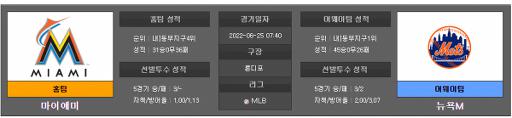 [마이애미]마이애미의 선발투수는 우완 샌디 알칸타라다.샌디 알칸타라는 이번 시즌 역시 매우 준수한 활약을 펼치고 있는 상황이다.샌디 알칸타라는 이번 시즌 14경기에 등판해 7승 2패 1.72 era를 기록하고 있다.세부 지표 역시 매우 좋은 샌디 알칸타라다.알칸타라는 메츠 타선을 상대로 147타수에서 32피안타를 허용한 경험이 있다.피트 알론소 상대로 21타수에서 4피안타 1피홈런 JD 데이비스 상대로 10타수에서 4피안타 프란시스코 린도어 상대로 16타수에서 5피안타를 허용한 경험이 있다.마이애미는 최근 3연승을 기록하면서 매우 좋은 모습을 보여주고 있다.타선에서 확실한 모습을 보여주었던 지난 3경기의 마이애미다.마이애미는 타선에서 재즈 치즌홈 조지 솔레르가 준수한 모습을 보여주며 타선을 이끌어주고 있다.마이애미 불펜의 필승조 마무리 태너 스콧 셋업 앤서니 배스 스티븐 오커트로 이루어져있다.이들 필승조는 22일 경기에 등판해 승리와 세이브를 달성하며 준수한 모습을 보여주었다.이들 필승조는 툭수 부담이 적기 때문에 이번 경기 역시 문제 없이 등판이 가능할 것으로 보인다.[메츠]메츠의 선발투수는 우완 타이후안 워커다.워커는 이번 시즌 11경기에 등판해 5승 2패 2.88 era를 기록하며 매우 준수한 모습을 보여주고 있다.워커는 흔들리지 않는 제구로 매우 안정적인 경기를 펼치고 있다.워커는 지난 2경기에서도 매우 준수한 모습을 보여주었다.워커는 마이애미 타선을 상대로 72타수에서 16피안타를 허용한 경험이 있다.브라이안 데 라 크루즈 상대로 10타수에서 4피안타 존 베르티 상대로 4타수에서 2피안타 재즈 치즌홈 상대로 7타숭서 2피안타 헤수스 아길라르 상대로 8타수에서 2피안타를 허용한 경험이 있다.메츠는 휴스턴 상대로 역부족인 모습을 보여주었다.다만 마이애미와 최근 시리즈에서 3승 1패를 기록했기 떄문에 자신감을 가질 수 있을것으로 보인다.메츠는 타선에서 프란시스코 린도어 피트 알론소가 준수한 모습을 보여주며 팀에 큰 보탬이 되고 있다.메츠는 부렌의 필승조 마무리 에드윈 디아즈 셋업 드류 스미스 세스루고로 이루어져있다.이들 필승조는 20일 경기에 블론세이브를 기록하며 아쉬운 모습을 보여주었다.이들 필승조는 체력적으로 문제가 없기 때문에 이번 경기에 문제 없이 등판이 가능할 것으로 보인다.[결론]알칸타라는 이번시즌 매우 좋은 경기력을 보여주고 있다.메츠전에서도 이미 좋은 흐름을 보였다.홈 경기에서 강한 모습이기에 안정감을 보여줄 가능성이 높아보인다.워커 또한 상승세를 보이고있다.원정 경기 기복을 보이기는 하지만 마이애미전 강한 모습을 보여준 흐름을 이어갈것으로 보인다.두 선발진이 투수전을 이끌어 갈 가능성이 높아보인다.이 경기는 7.5언더를 추천한다.승패 마이애미 -1.5패
