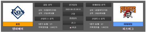 탬파베이의 부상여파가 부담이기는 하지만 그래도 홈 경기에서는 탬파베이의 투수력에 기대를 가져 볼 수 있다.