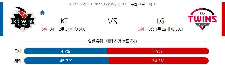 전일 경기에서 무려 5개 홈런포를 쏘아올리며 9-6, 역전승을 기록한 KT 라는 것이 주력 승부에서 제외하게 만들지만 6월에 짠물투구를 선보이고 있는 플럿코 투수가 선발 싸움에서 우위에 있는 경기다. LG 승리 가능성을 추천 한다.