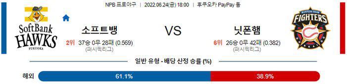 2연패에 빠진 소프트뱅크와 5연패 늪에 빠진 니혼햄의 만남 이다. 올시즌 자신의 최다 탈삼진 기록에 해당하는 14K 경기를 해내는등 니혼햄을 상대로 15이닝 22K, 2실점을 기록중인 센가 고다이 투수에 대한 기대치가 높은 선발 매치업 이며 소프트뱅크 타선은 올시즌 우와사와 나오유키 투수 공략에 성공한 기억이 있다. 소프트뱅크 승리 가능성을 추천 한다.