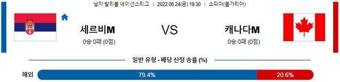 불가리아 중립구장 경기로 펼쳐지는 경기다. 세르비아의 승리가 예상되지만 캐나다의 저항이 만만치 않을 것으로 예상되는 요주의 경기다. 또한, 세르비아는 팀 공격의 핵심이 되는 마슬로비치가 고열 증상이 나타났다는 소식.