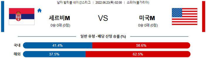 FIVB 랭킹 9위 세르비아는 1주차에 불가리아(3-1), 아르헨티나(3-2)에게 승리를 기록하고 프랑스(1-3), 독일(2-3)에게 패배를 당하며 이번대화 2승2패 성적을 기록하고 있다. 마슬로비치, 네델코비치가 호흡을 맞추고 있는 미들 블로커 라인은 분전하고 있지만 페르코비치가 라이트에서 상대 블로킹에 막히는 장면이 많았고 범실이 늘어 나면서 연패를 당한 상황. 세터의 토스가 흔들리다 보니 어렵게 배구를 해야 했고 속공의 사용이 적었던 탓에 상대 블로킹을 분산 시키지 못했던 상황. 또한, 2022-2023 시즌 KB손해보험과 함께하게 되는 니콜라 멜라냑(201cm)은 공격력은 좋았지만 수비에서 아쉬움이 나타났다.