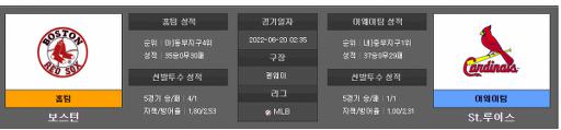 6월20일 MLB 보스턴 : 세인트루이스| `[보스턴] 보스턴의 선발투수는 우완 닉 피베타다. 피베타는 이번 시즌 13경기에 등판해 6승 4패 3.50 era를 기록하고 있다. 닉 피베타는 올 시즌 준수한 구위를 보여주며 준수한 성적을 거두고 있다는 평가다. 닉 피베타는 최근 등판에서도 안정적인 모습을 보여주었다. 닉 피베타는 세인트루이스 타선을 상대로 19타수에서6피안타를 허용한 경험이 있다. 놀란 아레나도 상대로 5타수에서 3피안타 폴 골드슈미트 상대로 6타수에서 3피안타 1피홈런 아담 웨인라이트 상대로 2타수에서 무피안타를 허용한 경험이 있다. 보스턴은 세인트루이스 상대로 1승 1패를 주고 받았다. 보스턴은 타선에서 라파엘 디버스 JD 마르티네즈 젠더 보가츠가 준수한 타격을 보여주고 있다. 보스턴은 불펜진에서도 좋은 활약을 보여주며 팀의 상승세를 이끌고 있다. 마무리 태너 하우크 셋업 존 그라이버 맷 스타함이 18일 경기에 연달아 등판해 홀드와 세이브를 기록하며 좋은 모습을 보여주었다. 이들 필승조는 직전 경기에서는 휴식을 취했기 때문에 이번 경기에 문제 없이 등판이 가능할 것으로 보인다. [세인트루이스] 세인트루이스의 선발투수는 우완 팔란테다. 팔란테는 이번 시즌 20경기 중 2경기에 선발 등판해 2승 1패 1.46 era를 기록하고 있다. 팔란테는 최근 불펜과 선발을 오가고 있다. 선발에서 더욱 좋은 모습을 보여주고 있다. 팔란테는 보스턴 타선을 상대로 첫 등판을 가지게 되었다. 세인트루이스는 최근 3연승 뒤 2연패를 당했지만 다시 승리를 거두면서 분위기를 끌어올리고 있다. 세인트루이스는 타선에서 토미 에드먼 폴 골드슈미트 놀란 아레나도가 매우 좋은 모습을 보여주며 팀 타선을 이끌고 있는 상황이다. 세인트루이스 불펜의 필승조에서는 마무리 라이언 헤슬리 지오바니 가예오스 셋업 제네시스 카브레라 닉 위트그린으로 이루어져있다. 이들 필승조는 15일 경기에 연달아 등판해 홀드와 세이브를 기록하며 준수한 모습을 보여주었다. 이들 필승조는 이후 경기에서 휴식을 취했기 때문에 이번 경기에 문제 없이 등판이 가능할 것으로 보인다. [결론] 피베타가 최근 좋은 모습을 보여주고있다. 승운도 따르고 있고 홈 경기에서 더욱 안정적이다. 세인트루이스를 상대로 삼진 비율이 좋았다는점도 이번 경기 기대를 가져 볼 수 있는 부분이다. 펠런트는 기회를 얻은 경기에서 좋은 활약을 보여주고 있다. 보스턴을 처음 상대하는 부분에서도 좋은 모습을 보여줄 가능성이 높아보인다. 다만 이닝 소화력에서의 문제점이 나타날 가능성이 높다. 불펜에서도 최근 보스턴이 세인트루이스보다 안정적이다. 이 경기는 보스턴의 승리를 추천한다. 언오버 9.5오버 |