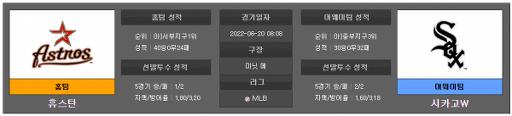 6월20일 MLB 휴스턴 : 화이트삭스| [휴스턴] 휴스턴의 선발투수는 우완 크리스티안 하비에르다. 하비에르는 이번 시즌 12경기 중 8경기에 선발 등판해 3승 3패 3.20 era를 기록하고 있다. 하비에르는 나름대로 준수한 모습을 보여주고 있지만 최근 등판에서는 결과가 좋지 못했다. 하비에르는 화이트삭스 타선을 처음으로 상대한다. 변화구의 구위가 매우 좋지만 제구가 잘 되지 않는 하비에르다. 이번 경기 역시 제구가 관건이 될 것으로 보인다. 휴스턴은 최근 3연승 뒤 1패를 기록하며 아쉬운 모습을 보여주긴했지만 전체적으로 선수들의 컨디션이 올라와있다. 휴스턴은 타선에서 요단 알바레즈 카일 터커 마이클 브랜틀리로 이루어져있다. 휴스턴 불펜의 필승조 마무리 라이언 프레슬리 셋업 라파엘 몬테로 라인 스타넥으로 이루어져있다. 이들 필승조는 현재 등판이 줄어든 상황이다. 충분한 휴식을 취한 상황이기 때문에 문제 없이 등판이 가능할 것으로 보인다. [화이트삭스] 화이트삭스의 선발투수는 우완 마이클 코펙이다. 마이클 코펙은 리그 최고의 구위를 가지고 있는 선발투수다. 마이클 코펙은 이번 시즌 11경기에 등판해 2승 2패 1.92 era를 기록하고 있다. 마이클 코펙은 휴스턴 타선을 처음으로 상대한다. 마이클 코펙은 이번 시즌 최고의 구위를 기록하고 있다. 매경기 안정적인 성적을 거두고 있다. 관건은 동료들의 득점지원으로 보인다. 화이트삭스는 최근 5경기에서 4승 1패를 기록하며 준수한 모습을 보여주고 있다. 화이트삭스는 타선에서 앤드류 본 호세 아브레유가 타선에서 매우 좋은 집중력을 보여주고 있다. 장타는 적지만 타율이 리그 상위권에 올라있는 화이트삭스다. 화이트삭스 불펜의 필승조는 마무리 켄달 그레브먼 셋업 조 켈리 레이날도 로페즈로 이루어져있다. 이들 필승조는 최근 등판기회를 잡지 못하고 있는 상황이다. 이들 필승조는 이번 경기에 문제 없이 등판이 가능할 것으로 보인다. [결론] 하비에르는 기복을 보이고있지만 홈 경기에서는 좋은 모습을 보여준다. 이번 경기에서도 이는 충분히 기대를 가져 볼 수 있을만한 부분이다. 코페치 또한 이번시즌 좋은 모습을 보여주고있다. 안정적인 흐름이 이어질 가능성이 충분하다. 휴스턴을 상대로 상대전적이 많지 않다는점 또한 기대요소가 될 수 있을것으로 보인다. 두 선발진이 안정감을 보일 가능성이 높다. 이 경기는 7.5언더를 추천한다. 승패 휴스턴 승 |