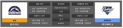 6월20일 MLB 콜로라도 : 샌디에이고| `[콜로라도] 콜로라도의 선발투수는 우완 안토니오 센자텔라다. 센자텔라는 이번 시즌 10경기에 등판해 2승 3패 4.79 era를 기록하고 있다. 안토니오 센자텔라는 최근 5번의 등판에서 주소모두 팀이 패배를 당하며 아쉬운 모습을 보여주었다. 센자텔라는 구속이 떨어지며 어려운 경기를 펼치고 있다. 센자텔라는 샌디에이고 타선을 상대로 92타수에서 26피안타를 허용한 경험이 있다. 제이크 크로넨워스 상대로 11타수에서 5피안타 에릭 호스머 상대로 22타수에서 5피안타 매니 마차도 상대로 19타수에서 8피안타 1피홈런 오스틴 놀라 상대로 9타수에서 2피안타를 허용한 경험이 있다. 콜로라도는 최근 1승3패를 거두면서 아쉬운 모습을 보여주고 있다. 그나마 타선이 조금씩 살아난다는 점이 긍정적인 콜로라도다. 특히 CJ 크론이 살아나고 있는 것이 긍정적이다. 콜로라도 불펜의 필승조 마무리 대니얼 바드 셋업 알렉스 콜로메 카를로스 에스테베즈는 나름대로 준수한 모습을 보여주고 있다. 이들 필승조는 현재 투구수 부담이 없는 상황이기 때문에 이번 경기에 문제 없이 등판이 가능하다. [샌디에이고] 샌디에이고의 선발투수는 좌완 블레이크 스넬이다. 스넬은 이번 시즌 5경기에 등판해 0승 3패 5.04 era를 기록하고 있다. 스넬은 복귀 이후 제구가 흔들리면서 아쉬운 모습을 보여주고 있다 스넬은 최근 등판에서 6이닝 동안 2실점을 기록하며 반등의 발판을 마련했다. 스넬은 콜로라도 타선을 상대로 89타수에서 24피안타를 허용한 경험이 있다. 찰리 블랙몬 상대로 10타수에서 3피안타 CJ 크론 상대로 12타수에서 5피안타 1피홈런 요나단 다자 상대로 8타수에서 5피안타를 허용한 경험이 있다. 샌디에이고는 최근 4연승 뒤 1패를 기록하는등 전체적인 분위기는 나쁘지 않다. 타선에서 주릭슨 프로파 제이크 크로넨워스 매니 마차도 루크 보이트등이 준수한 모습을 보여주고 있다. 샌디에이고 불펜의 필승조 마무리 테일러 로저스 셋업 루이스 가르시아 나빌 크리스멧은 17일 경기에 연달아 등판해 세이브를 기록하며 준수한 모습을 보여주었다. 이들 필승조는 이후 휴식을 취했기 때문에 이번 경기에 문제 없이 등판이 가능할 것으로 보인다. [결론] 센자텔라가 최근 좋은 흐름을 보이고있다. 샌디에고를 상대로 홈 맞대결에서 좋은 흐름을 보여준 부분을 감안한다면 이번 경기에서도 충분히 호투를 기대해 볼 수 있을것으로 보인다. 스넬은 복귀하여 나름 활약을 보였지만 확실히 과거와 같은 모습은 아닌 상황이다. 다만 콜로라도를 상대로는 좋은 모습을 보여주었다. 기대요소는 충분한 경기이다. 이 경기는 샌디에고의 승리를 추천한다. 언오버 12.5언더 |