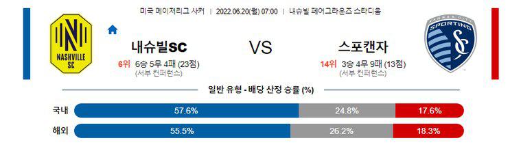 내슈빌이 최근 7경기에서 5번의 오버(2.5 기준)가 나온 점, 캔자스시티도 7경기 연속 실점을 허용하고 있는 점을 고려하면 오버(2.5 기준)의 가능성이 매우 높겠다. 또한 후술하겠지만, 내슈빌은 최근 서부리그에 적응하며 매우 좋은 경기력을 뽐내고 있는 중. 특히, 홈에서 아직까지 단 1패도 허용하지 않고 있다. 반면, 캔자스시티는 지난 시즌 3위 팀의 위엄은 온데간데 없고 서부리그 꼴찌를 기록 중. 반대로 원정에서 단 1승도 거두지 못하고 있는 상황. 이번 일정도 홈 팀 내슈빌의 승리가 예상된다.