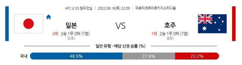 호주가 본 대회 내내 언더(2.5 기준) 경기를 치른 점, 토너먼트이기 때문에 양 팀 주소모두 신중하게 임한다는 점을 고려하면 언더(2.5 기준)의 가능성이 매우 높겠다. 또한 후술하겠지만, 일본은 21세 이하 대표팀으로 8강까지는 경기를 잘 풀어왔으나 체력적인 부분, 경험적인 부분에서 다소 약세를 보이는 중. 직전 경기에서 우즈벡에 아무런 저항도 하지 못하고 무기력하게 패했다. 호주도 마찬가지로 사우디에게 0-2로 패하긴 했으나, 피지컬이 더 우세한 조건을 활용해 일본에게 강하게 밀고 들어올 것으로 보인다. 호주의 승리가 예상된다.