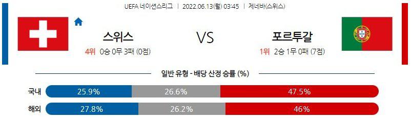 스위스의 홈 경기이기도 하며 스위스가 직전 맞대결 대량 실점을 의식해 다소 신중한 경기를 펼칠 것으로 보이기 때문에 언더(2.5 기준)의 가능성이 높겠다. 또한 양 팀 기세는 정반대라고 볼 수 있다. 포르투갈은 2연승을 기록하며 기세를 타고 있는 반면, 스위스는 3연패로 이번 네이션스리그에서 전혀 해법을 찾지 못하고 있다. 이번 일정도 마찬가지로 포르투갈이 상승세를 유지할 것으로 보인다. 포르투갈 승 / 언더(2.5 기준)를 추천한다.