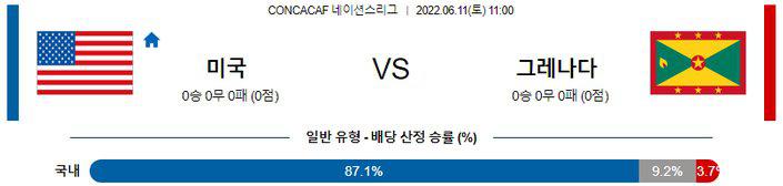 후술하겠지만, 미국은 전 포지션에 걸쳐 유럽에서 뛰고 있는 선수들이 즐비하다. 제 2의 황금세대를 구가하며 전성기를 달리고 있는 중. 북중미 지역에서도 최약체로 분류되는 그레나다를 상대로 다득점과 함께 대승을 거둘 것으로 보인다. 일반 승은 물론이고 핸디캡 승(H-3.0)과 오버(5.5 기준) 주소모두 가능하겠다.