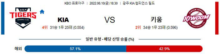 원정에서 잊을만 하면 한번씩 조기강판 패배가 나오고 있는 최원태 투수의 불안 요소가 더 크다고 생각 된다. 기아 승리 가능성을 추천 한다.