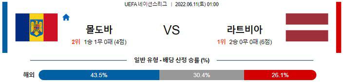 라트비아의 공격력도 매우 뛰어난 수준은 아니며, 몰도바가 이번 일정에서 대놓고 5백을 펼칠 것으로 예상되기 때문에 저득점 페이스가 유력한 상황. 언더(2.5 기준)의 가능성이 높겠다. 또한 후술하겠지만, 라트비아는 리그 D에서 유일한 2승을 거두며 리그 C로의승격을 노리고 있는 전력. 몰도바도 아직까지 패배가 없지만 월드컵 최종 예선에서 1승도 거두지 못하는 등 라트비아에 비할 전력은 아닌 수준이다. 이번 일정도 강력한 수비를 바탕으로 하는 라트비아의 승리가 예상된다.