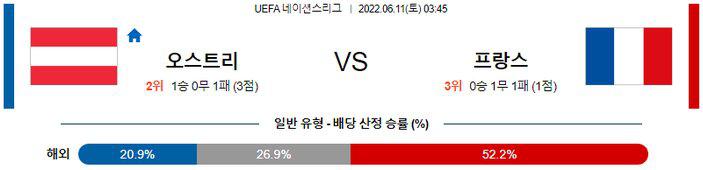 프랑스의 공격력은 유럽 최고 수준이라는 점과 오스트리아도 직전 2경기에서 주소모두 오버(2.5 기준)를 기록한 점을 고려하면 오버(2.5 기준)의 가능성이 높겠다. 또한 후술하겠지만, 프랑스는 아직까지 유럽 네이션스리그 승리가 없는 상황. 이번 일정에서 승리를 위해 100%의 전력을 쏟아 부을 것으로 보인다. 여기에 오스트리아가 랑닉 감독의 기조처럼 강한 압박을 시도할 것으로 예상되지만, 프랑스에는 중원에서 압박을 풀어낼 선수들과, 전방으로의 한번의 침투 패스를 통해 상대를 위협할 카드가 존재하기 때문에 이번 일정은 프랑스의 승리가 예상된다.