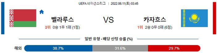 카자흐스탄의 전력 상 많은 득점을 터뜨리기에는 한계가 있기 때문에 언더(2.5 기준)의 가능성이 매우 높겠다. 양 팀 주소모두 최근 3경기 연속 언더(2.5 기준)가 나온 점을 참고하면 좋다. 또한 후술하겠지만, 카자흐스탄은 최근 확실한 컨셉으로 A매치에서 기세를 이어 나가고 있다. 벨라루스와는 정반대의 상황. 벨라루스는 심지어 핵심 공격 자원들이 주소모두 부상으로 빠지기 때문에 이번 일정은 카자흐스탄의 승리가 예상된다.