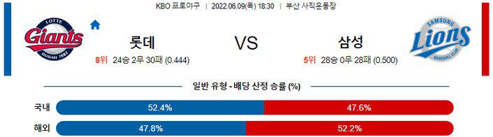 전일 경기 4-2 승리로 사직 롯데전 5연승의 휘파람을 불게 된 삼성 이지만 연승의 과정에서 필승조 불펜의 소모가 많았고 허윤동 투수는 믿음이 떨어진다. 반면, 롯데는 전일 경기 9회 추격의 모습을 보여주며 경기를 마무리 했다는 것이 목요일 경기 흐름에 긍정적인 요소로 작용할 것이다. 롯데 승리 가능성을 추천 한다.