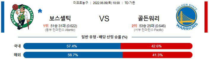 2차전에서는 골든스테이트가 매치업을 바꾸는 모습을 보이면서 보스턴의 외곽포를 견제하는 모습을 보였고, 결과적으로 이것이 대성공을 거뒀다. 3차전에서 보스턴이 어떤 모습을 보일지가 관건이 될 듯하다. 그래도 홈으로 돌아가는 데다가 3차전에서는 보통 홈팀의 승리가 많이 나오는 편이기 때문에 일단은 보스턴의 승리를 먼저 보는 것이 좋겠다. 마침 골든스테이트가 원정에서 재미를 잘 못 보는 편이기도 하고, 보스턴이 이번 플레이오프에서 연패가 없을 정도로 조정을 잘 하는 편이다. 보스턴의 승리를 예상하며, 핸디캡이 -2.5점으로 작아 핸디캡 승리까지 같이 봐도 좋을 듯하다. 언오버 기준점이 212.5점인데, 2차전이 페이스 대비 오히려 정상적인 득점 양상이라고 봐야 한다. 느린 페이스의 경기가 나올 확률이 높고, 1차전같이 비정상적인 슈팅이 아니라면 언더부터 고려해야 한다.