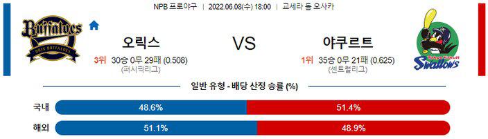 교류전에서 철저한 팀 타격으로 6연승을 만들어 낸 오릭스의 상승세에 베팅 포커스를 맞춰야 한다. 달리고 있는 말 등에 올라타자. 오릭스 승리 가능성을 추천 한다.