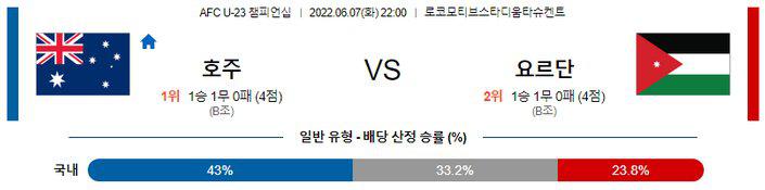 이번 대회가 중동에서 열린다는 점과 양 팀 주소모두 앞선 두 경기에서 언더(2.5 기준)가 나왔다는 점을 고려하면 언더(2.5 기준)의 가능성도 존재한다. 후술하겠지만, 호주 대표팀은 유럽에서 뛰고 있는 선수들의 개인 능력을 바탕으로 현재까지 1승 1무를 기록 중. 요르단도 만만치 않은 전력으로 대회 복병 역할을 수행하고 있지만 피지컬을 앞세운 호주의 승리가 예상된다.
