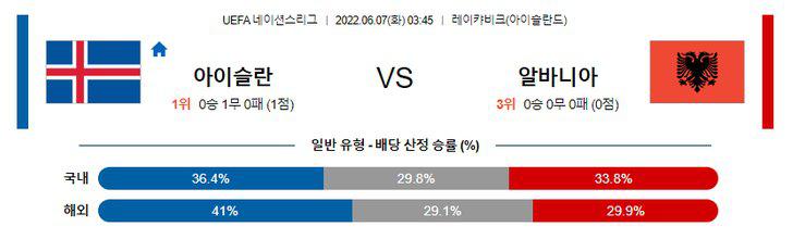주력 1선 자원들이 부상으로 결장하며, 아이슬란드도 저자세의 경기가 예상되기 때문에 이번 일정은 언더(2.5 기준)의 가능성이 높겠다. 또한 양 팀의 피파랭킹은 비슷하지만, 최종 예선에서의 성적과 선수 면면은 차이가 많이 난다. 특히, 알바니아 대표팀에는 세리에A에서 주전으로 발돋움 한 선수들이 대거 포진돼 있다. 때문에 알바니아의 승리가 예상된다.
