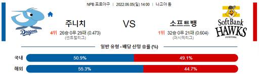 주니치는 어제, 선발 다카하시가 6이닝, 5개의 피안타, 탈삼진 10개, 1실점으로 마운드를 내려왔고, 이어 3명의 불펜(소부에, 승리)이 무실점으로 방어했으며, 마르티네스의 홈런포를 포함한 타선이 7안타 4득점으로 분전하며 경기를 승리로 이끌었다. 오늘 선발 야나기는 5월 29일, 오릭스 타선을 상대로 2.1이닝, 5개의 피안타, 5실점으로 패전투수가 됐다. 5월, 5경기, 2승 2패, ERA 2.93, 긴 이닝을 소화하고 있는 야나기는 연속 부진을 보이는 스타일이 아니다. 빠른 발의 슈토, 장거리포 야나기타, 나카무라 등 소프트뱅크 타선을 상대로 본인의 피칭을 보이며 승운을 챙길 것으로 기대한다. 소프트뱅크는 4일, 선발 오오제키가 6이닝, 3개의 피안타, 피홈런 1개, 1실점으로 호투했지만, 이어 3명의 불펜(츠모리, 패배)이 흔들리며 3실점, 타선이 7안타 2득점에 그쳐 경기를 내주고 말았다. 오늘 선발 스기야마는 5월 26일, 요코하마 타선을 상대로 5이닝, 6개의 피안타, 피홈런 2개, 3실점으로 패전투수가 됐다. 올 시즌 로테이션에 합류하여 5경기, 1승 2패, ERA 6.93의 성적으로 그다지 좋은 상황은 아니다. 오늘 마르티네스, 비시에도, 아베 등 주니치 장거리포를 상대로 일격을 당하며 마운드를 내려올 위험이 크다. 홈팀 주니치의 승리를 예측한다.