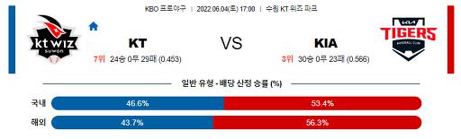 케이티의 승리를 본다. 선발에서 엄상백이 홈에서 나설 케이티가 확실한 우위를 가져갈 수 있다. 개명하며 새로운 인생을 꿈꾸는 김도현은 이번 시즌 한 차례 등판에서 아웃카운트를 하나도 잡지 못하는등 아직은 팀의 기대에 부응할 것으로 보이진 않는다. 타선도 서서히 살아나는 케이티가 기아에 빠르게 위닝시리즈를 가져갈 것이다. 케이티의 다득점을 보기에 오버 경기다.