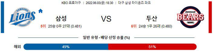 삼성은 목요일 원정에서 키움 상대로 5-6 패배를 기록하며 시리즈 승패를 기록했다. 시즌 25승27패 성적. 선발 싸움에서 판정승을 기록했지만 6명의 구원 투수가 3실점을 허용했고 끝내기 밀어내기 볼넷으로 경기를 내준 상황. 반면, 두산은 목요일 홈에서 기아 상대로 3-4 패배를 기록하며 시리즈 3패를 기록했다. 3연패 흐름 속에 시즌 24승26패 성적. 6회까지 3-0, 리드를 잡고 있었던 경기에서 불펜이 무너지며 8년여 만에 기아를 상대로 스윕 패배를 당하는 충격을 경험하게 된 상황.