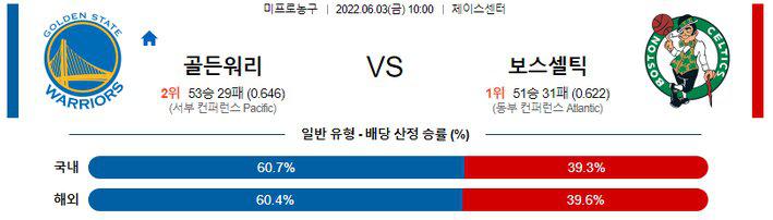 서부컨퍼런스 결정전에서 댈러스를 4-1로 꺽은 골든스테이트와 동부 컨퍼런스 챔피언 결정전에서 마이애미와 7차전까지 가는 혈전을 펼치고 올라온 NBA에서 파이널 1차전 이다. 골든스테이트는 핵심 전력들이 건재한 가운데 이번 파이널을 통해 게리 페이튼 2세와 오토 포터 주니어, 안드레 이궈달라 등 부상자 명단에 있던 핵심 벤치 멤버들이 대거 복귀를 앞두고 있다. 반면, 보스턴은 6일 간의 충분한 휴식을 취한 골든스테이트에 비해 밀워키와 경기에 이어서 마이애미와도 7차전까지 가는 대혈전을 치르고 올라오면서 체력적으로 많이 불리한 위치에 있고 원정경기 일정에 있는 상황. 골든스테이트 승리 가능성을 추천 한다.