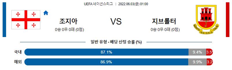 후술하겠지만, 지브롤터는 월드컵 최종 예선에서도 10경기 43실점을 허용한 바 있기 때문에 이번 일정도 대량 실점이 예상되며 오버(3.5 기준)의 가능성이 높겠다. 또한 지브롤터는 잉글랜드로 유스 선수들이 진출하기도 하며 소속 리그 팀이 유럽 클럽 대항전에도 출전하는 등 축구적으로 발전해 나가고 있으나, 아직까지 조지아에게 한참 부족한 것은 사실. 특히, 조지아는 홈에서 유럽의 내로라하는 강팀도 잡아낸 바 있기 때문에 이번 일정은 조지아의 승리가 예상된다.