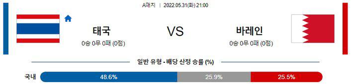후술하겠지만, 바레인의 수비진이 꾸준한 실점을 허용하고 있으며, 태국이 3월부터 치른 4번의 친선전에서 주소모두 득점을 기록하고 있기 때문에 이번 일정도 다득점 페이스가 예상된다. 오버(2.5 기준)의 가능성이 높겠다. 또한 최근에 베트남과 태국을 비롯한 동남아시아팀들의 높아진 수준이 눈에 띈다. 여전히 동, 서 아시아의 강팀들에게는 고전하는 모습이나, 그 아래 전력들에게는 대등한 경기를 펼칠 수준. 직전 맞대결에서도 태국이 3-1로 승리를 거둔 바 있기 때문에 이번 일정도 태국의 승리를 예상한다.