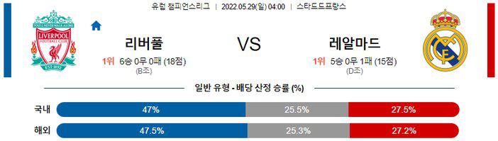 양 팀 주소모두 공격력이 워낙 뛰어난 팀이기에 이번 시즌 챔스에서 오버(2.5 기준)의 비율이 더 높았다는 점을 고려하면 오버(2.5 기준)의 가능성이 높겠다. 또한 후술하겠지만, 이번 일정의 핵심 격전지는 ‘중원’이다. 레알마드리드의 중원 ‘크카모 + 발베르데’는 조기 우승으로 인한 충분한 휴식을 부여 받았고, 그에 따라 체력적으로 여유가 있는 상황. 여기에 레알마드리드의 챔스 3연패를 이끈 경험치도 보유하고 있다. 반면 리버풀의 중원은 주소모두 부상과 체력적인 문제로 인해 제 컨디션이 아닌 상황. 중원에서 레알마드리드의 우위가 예상되기 때문에 리버풀이 자랑하는 강한 압박과 빠른 전개의 공격이 잘 이루어지지 않을 것으로 보이며 반대로 레알마드리드는 양, 질의 패스를 전방의 벤제마, 비니시우스, 호드리구에게 큰 어려움 없이 전달할 것으로 보인다. 레알마드리드의 승리를 예상한다. 최근 전적에서 레알마드리드가 압도하고 있다는 점도 참고하면 좋다.