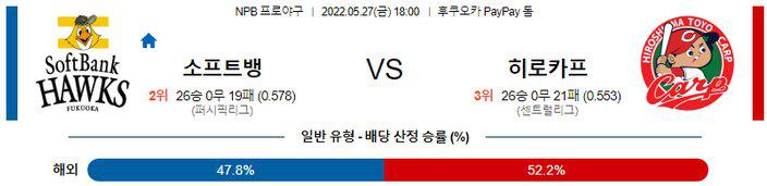 소프트뱅크는 목요일 원정에서 요코하마 상대로 1-5 패배를 기록하며 시리즈 1승2패를 기록했다. 시즌 26승19패 성적. 13개 잔루를 기록하는 답답한 결정력이 나타났고 소프트뱅크 선발 투수들 중에서 가장 불안한 선발 순번이 되는 스기야마 가즈키 투수가 피홈런의 공포에서 벗어나지 못한 경기. 반면, 히로시마는 목요일 홈에서 지바롯데 상대로 3-6 패배를 기록하며 시리즈 1승2패를 기록했다. 시즌 26승21패 성적. 수비 도움을 받지 못한 구리 아렌 투수가 4.1이닝 6실점(5자책)으로 무너진 경기. 또한, 12안타를 기록하고 3득점에 그친 타선의 연결 능력도 아쉬웠다.