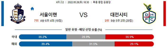 서울이랜드가 최근 실점이 늘어 직전 6경기 중 4경기에서 오버(2.5 기준)가 나온 점, 대전도 공격력이 뛰어나 최근 7경기 중 5경기에서 오버(2.5 기준)가 나온 점을 고려하면 오버(2.5 기준)의 가능성이 높겠다. 또한 후술하겠지만, 대전은 시즌 초반 코로나19로 인해 제대로 된 전지 훈련을 진행하지 못하며 부진을 면치 못했다. 다만 경기를 치를수록 부상자들도 돌아왔으며, 조직력이 갖춰져 상승세를 타고 있다. 반면 서울이랜드는 이번 시즌 내내 경기력을 유지하는 데 어려움을 겪고 있는 중. 이번 시즌 첫번째 맞대결에서도 대전이 승리를 챙긴 바 있다. 이번 일정도 대전의 승리가 예상된다.